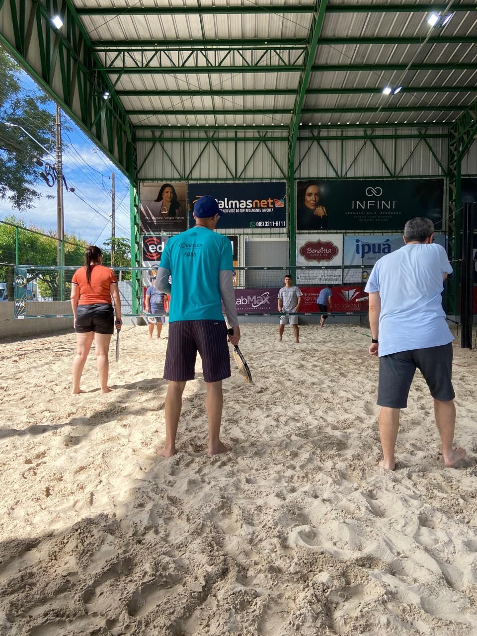 A atividade de beach tennis foi acompanhada pela coordenadora Patrícia Motter, pela educadora física Cleidineia Correia e pela professora de dança Michele Dutra, que participaram ativamente do cuidado, da organização e do incentivo aos pacientes durante toda a vivência.